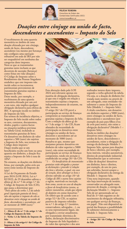 «O recebimento de uma quantia monetária no âmbito de uma doação efetuada por um cônjuge, unido de facto, descendente, ascendente (ou mesmo por herança) não configura uma operação tributável em sede de IRS por não ser enquadrável em nenhuma das categorias deste imposto. Note-se que as transmissões gratuitas tanto incluem as que decorrem de sucessão (herança) como feitas em vida (doação). O Código do Imposto sobre o Rendimento das Pessoas Singulares estabelece que este imposto não incide sobre os incrementos patrimoniais provenientes de transmissões gratuitas sujeitas a Imposto do Selo (…)»