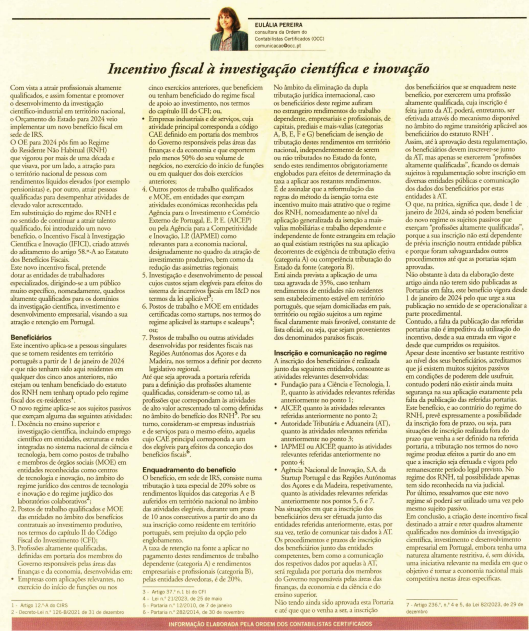 «Com vista a atrair profissionais altamente qualificados, e assim fomentar e promover o desenvolvimento da investigação científico-industrial em território nacional, o Orçamento do Estado para 2024 veio implementar um novo benefício fiscal em sede de IRS. O OE para 2024 pôs fim ao Regime do Residente Não Habitual (RNH) que vigorou por mais de uma década e que visava, por um lado, a atração para o território nacional de pessoas com rendimentos líquidos elevados (por exemplo pensionistas) e, por outro, atrair pessoas qualificadas para desempenhar atividades de elevado valor acrescentado (…)»